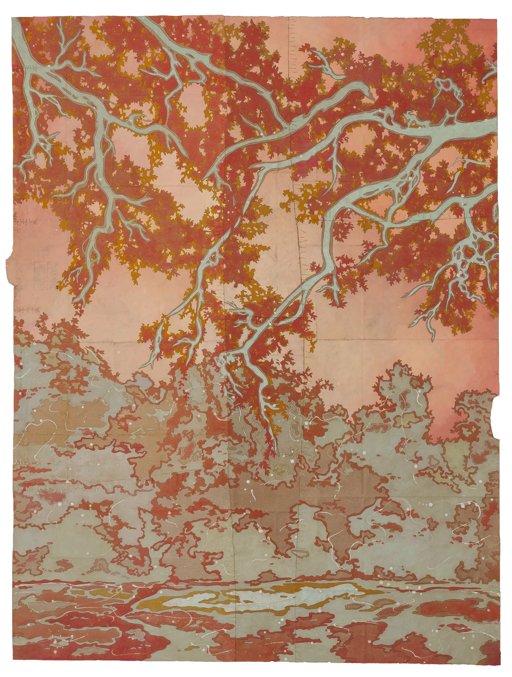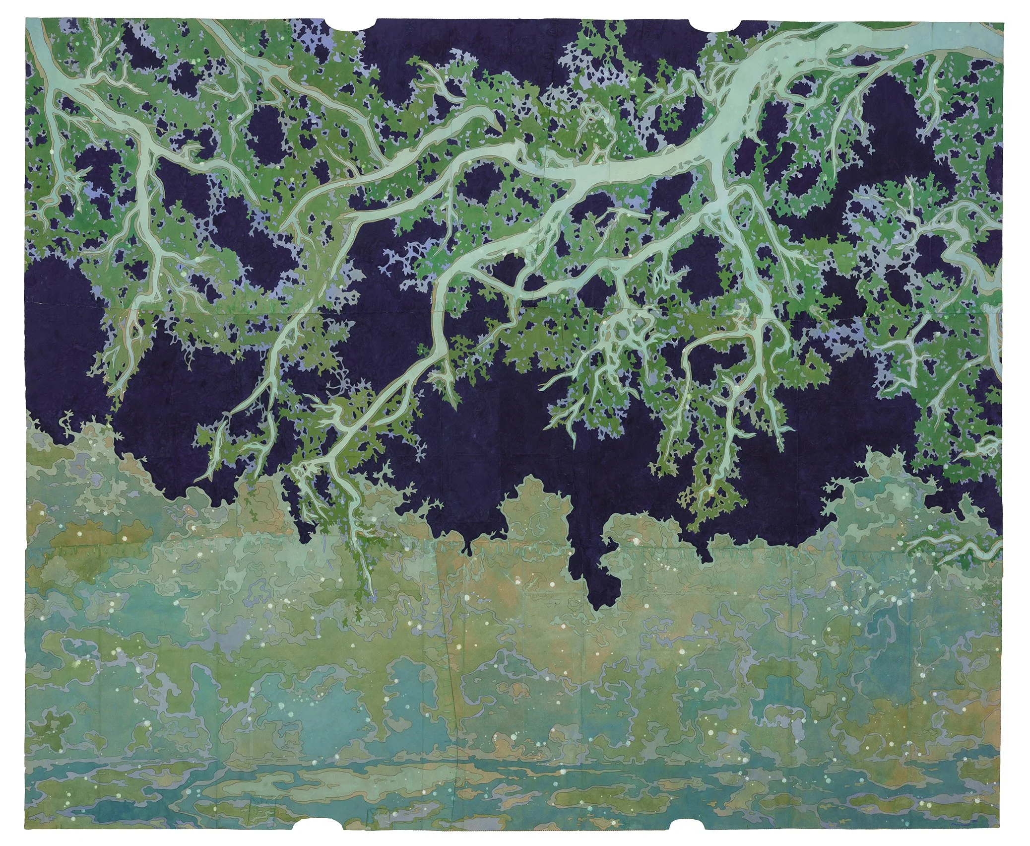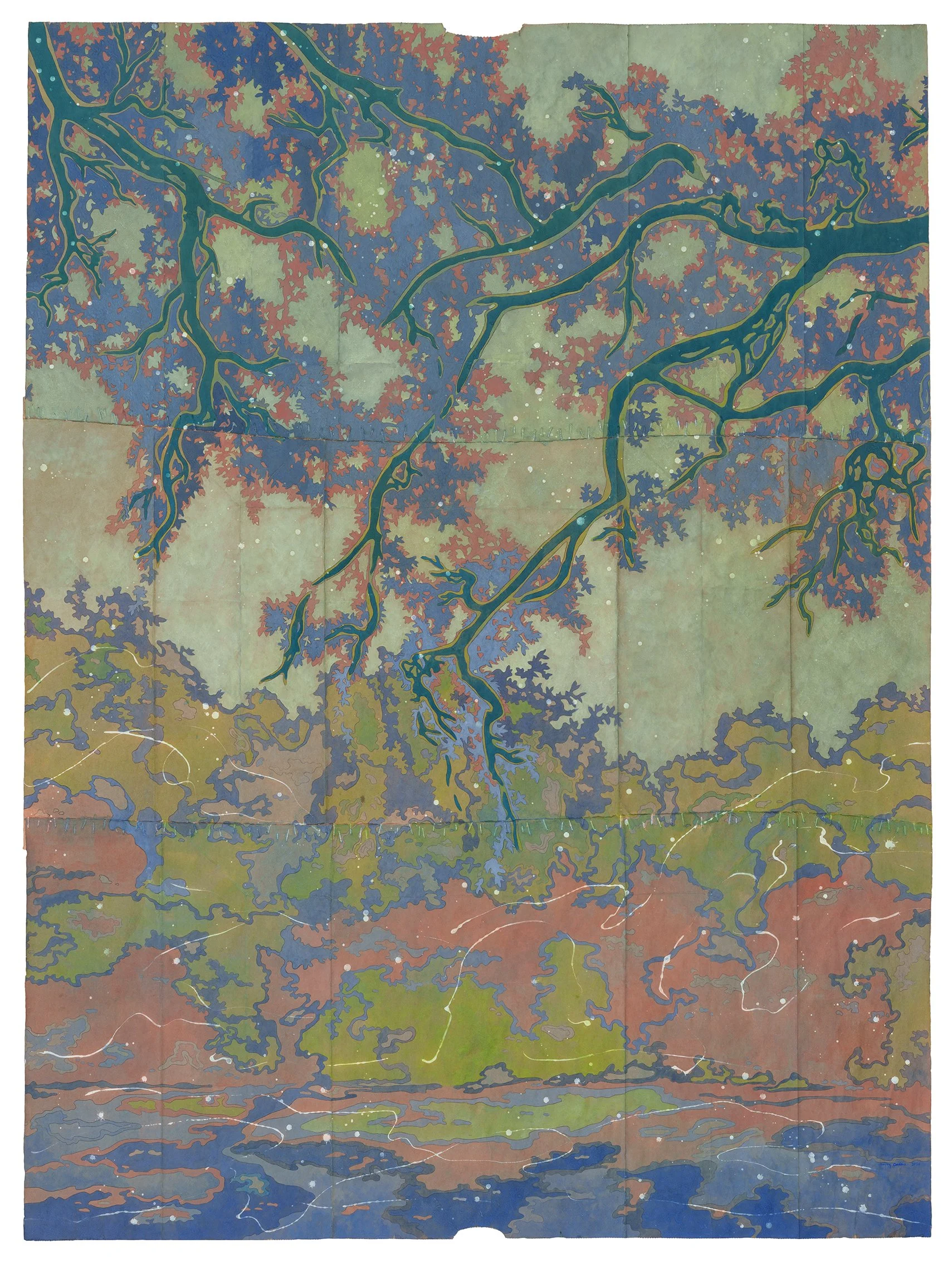 river of stars, 2026. Gouache, flashe and thread on archivally treated paper bags. 26.5 x 36 inches