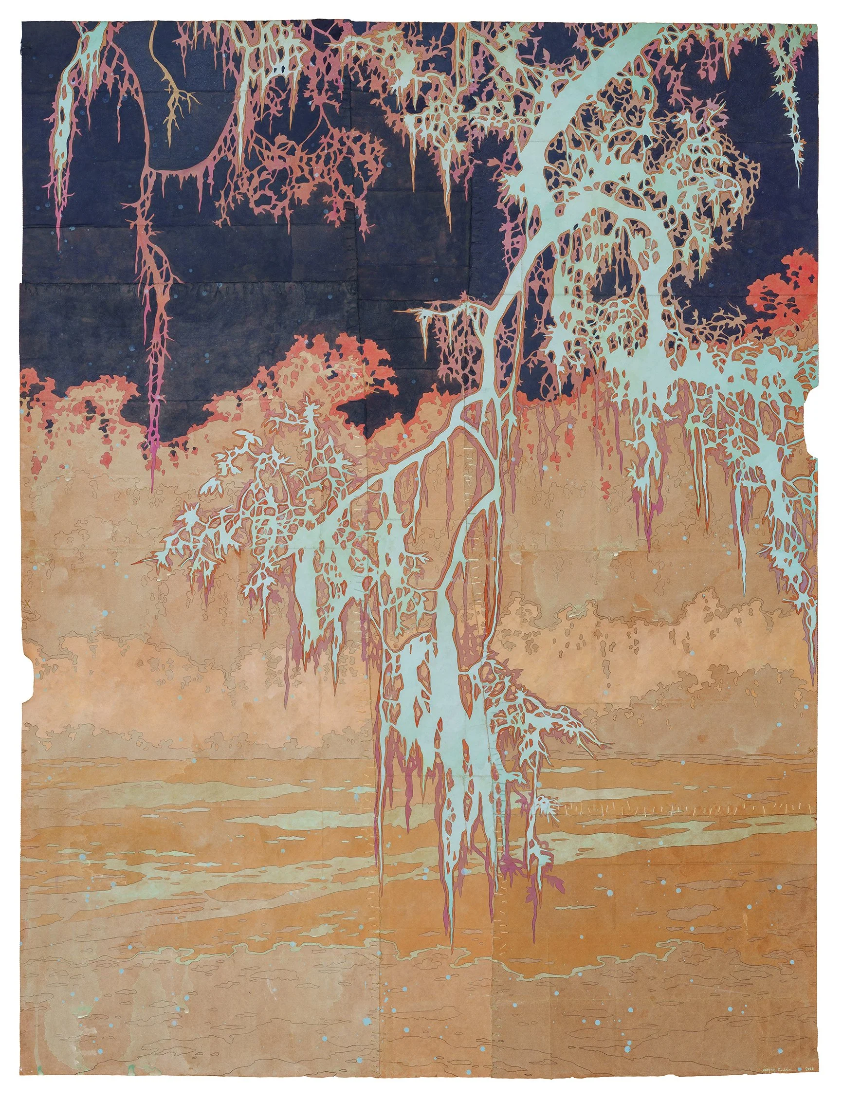 dreaming in the half-light, 2026. Gouache, flashe and thread on archivally treated paper bags. 48 × 36 inches
