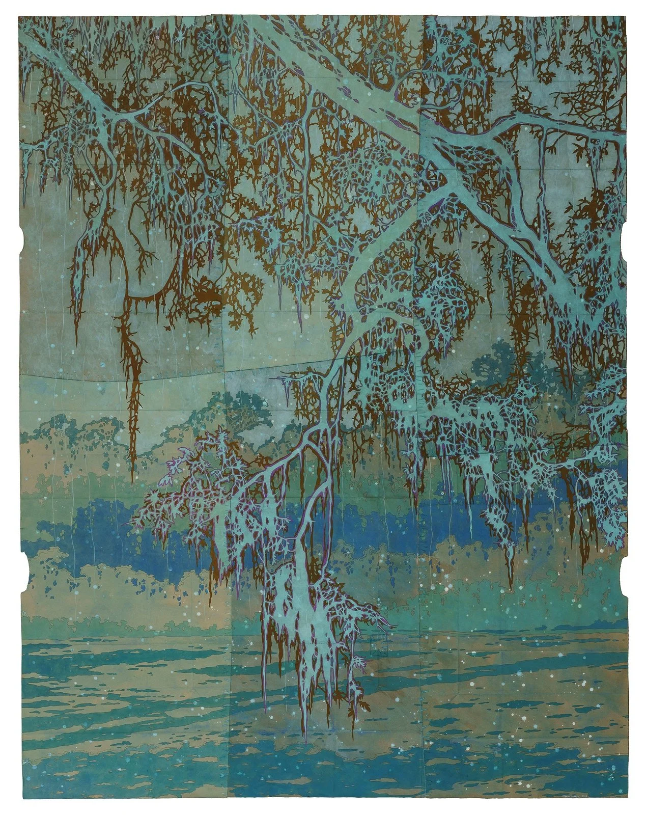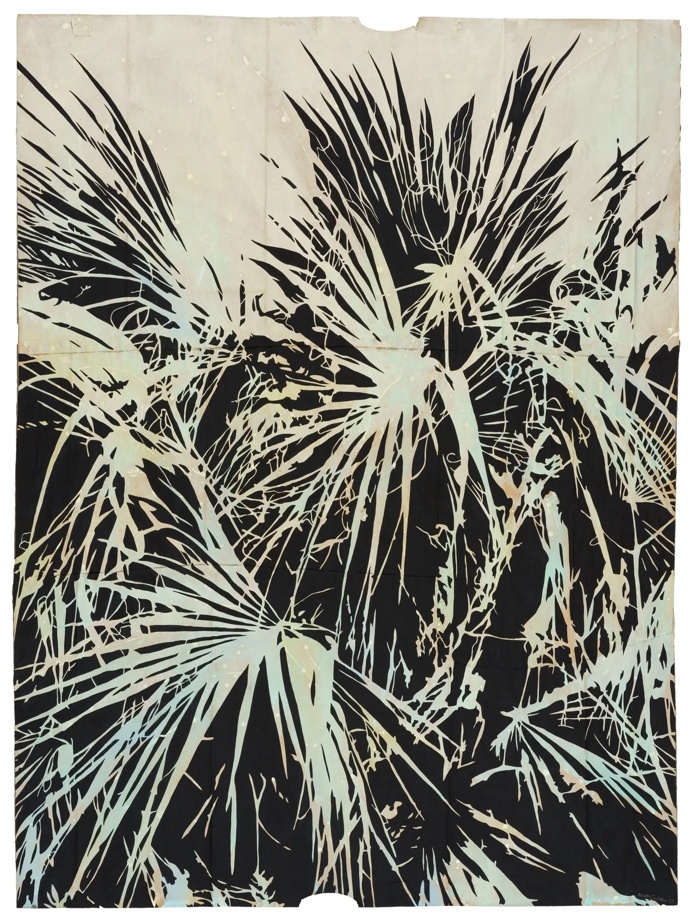 Storm Vigil, 2023. Gouache, flashe and thread on archivally treated paper bags. 61.75 x 48 inches