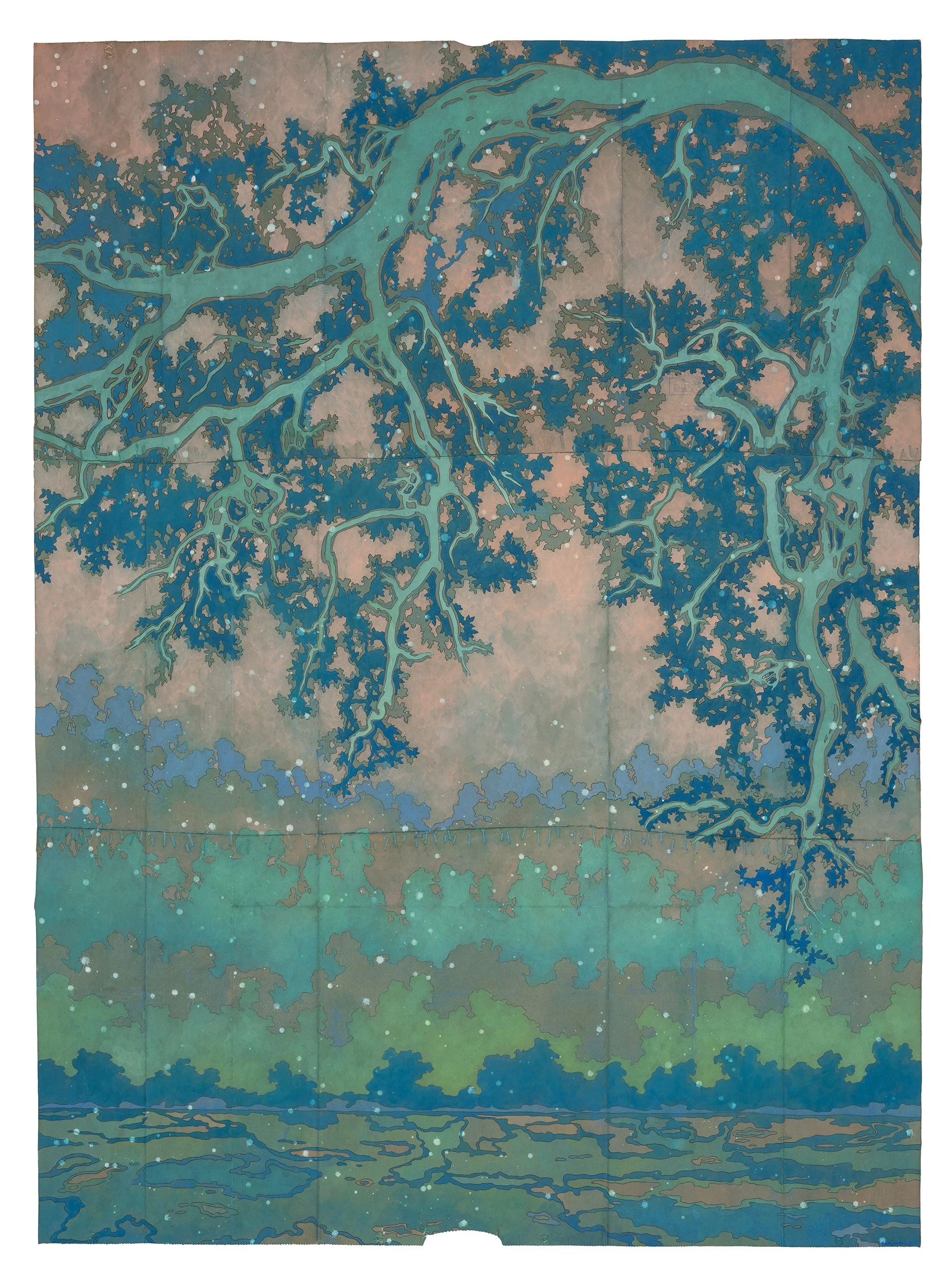 Song of oak and pearl, 2023. Gouache, flashe and thread on archivally treated paper bags. 48 x 35.5 inches