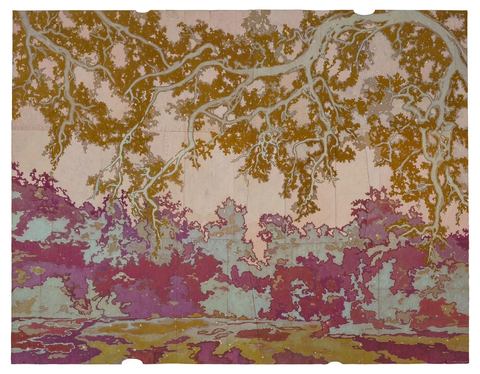 Cloud Azalea, 2023. Gouache, flashe and thread on archivally treated paper bags. 48 x 62 inches