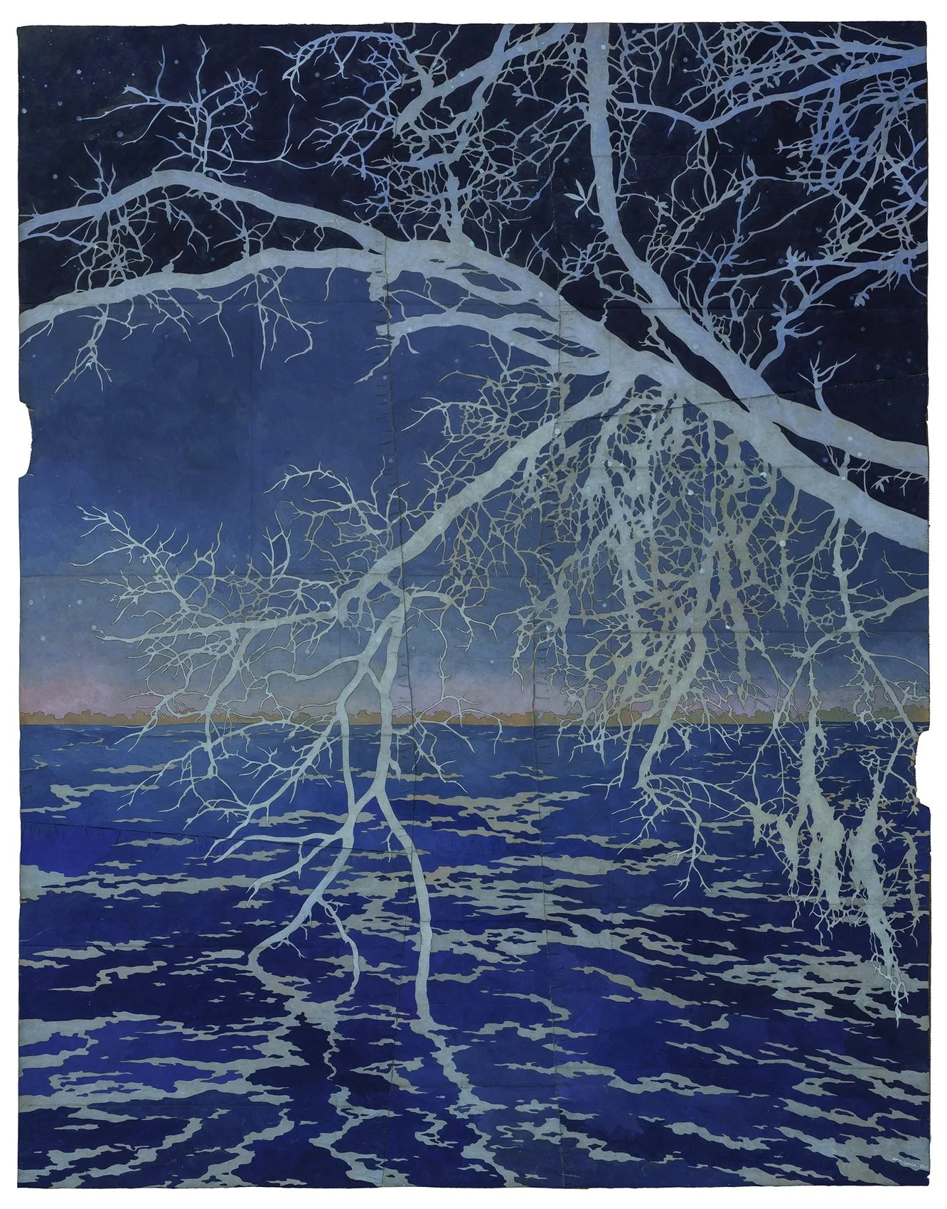 a world is blue with night, 2023. Gouache, flashe and thread on archivally treated paper bags. 49 x 38.5 inches