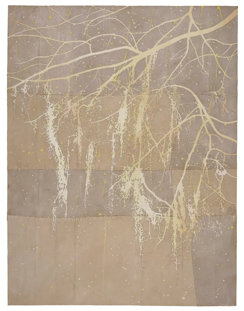 Rise, fall away, 2022. Gouache, flashe and thread on archivally treated paper bags. 48 x 36 inches