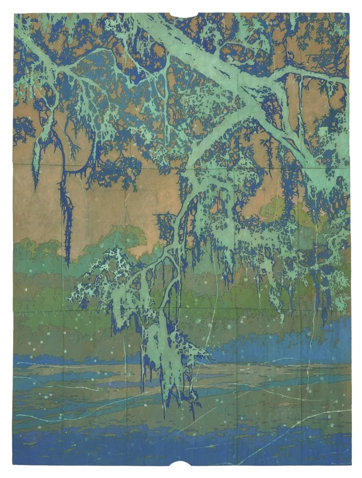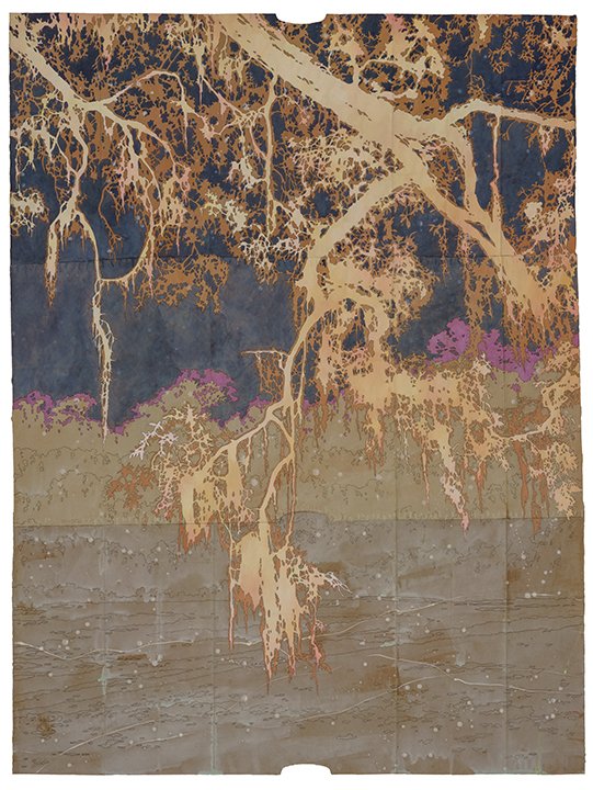 Moss and Flame, 2022. Gouache and thread on archivally treated paper bags. 48 x 36.25 inches