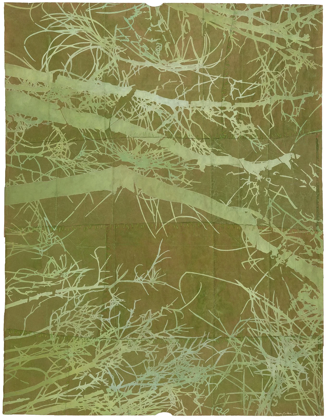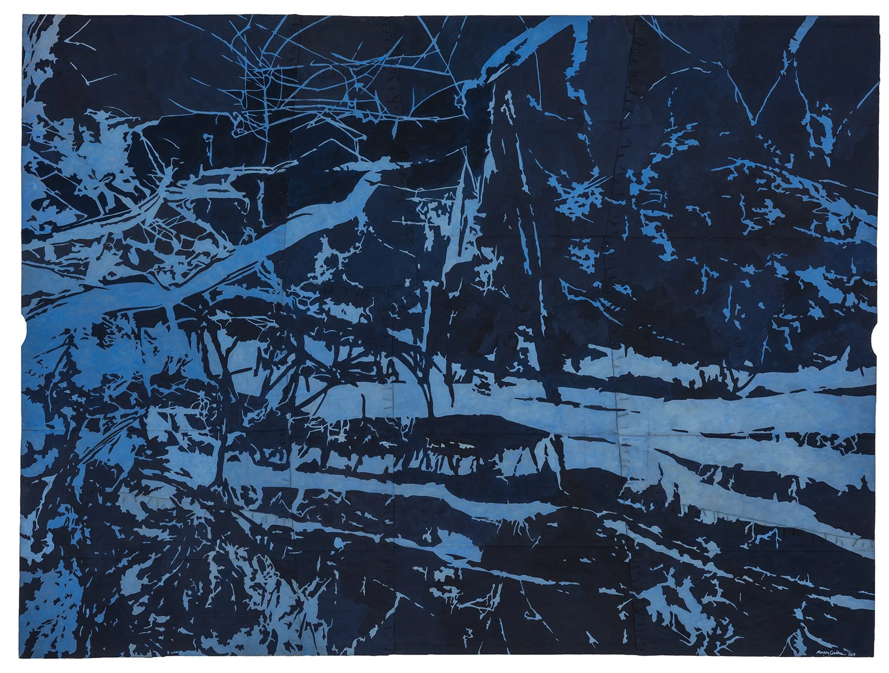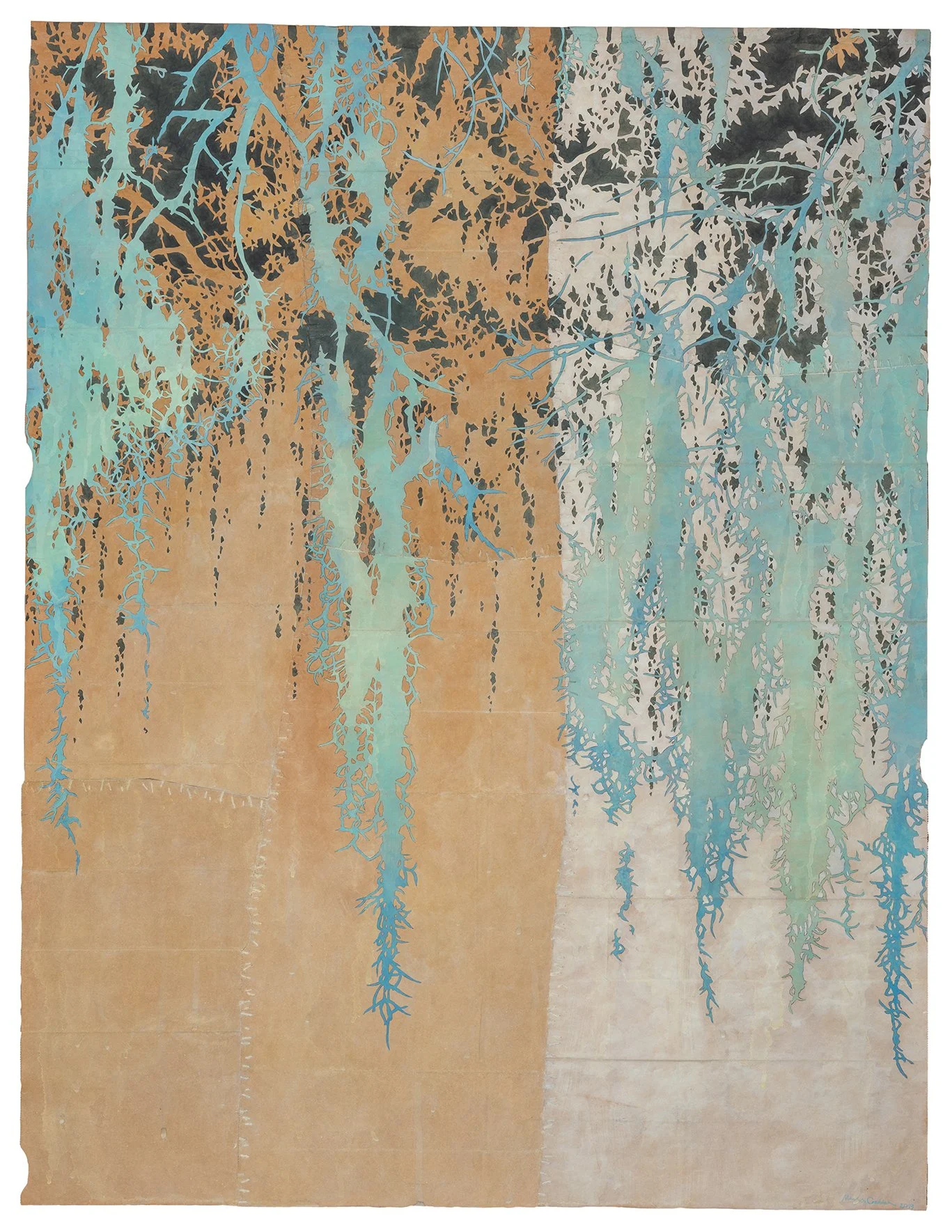 The Sea in the Trees, 2019. Gouache and thread on archivally treated paper bags. 50.5 x 38.25 inches