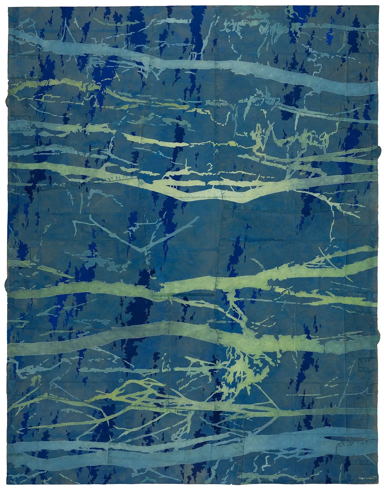 Ghost Pond, 2019. Gouache and thread on archivally treated paper bags. 49 x 37.5 inches