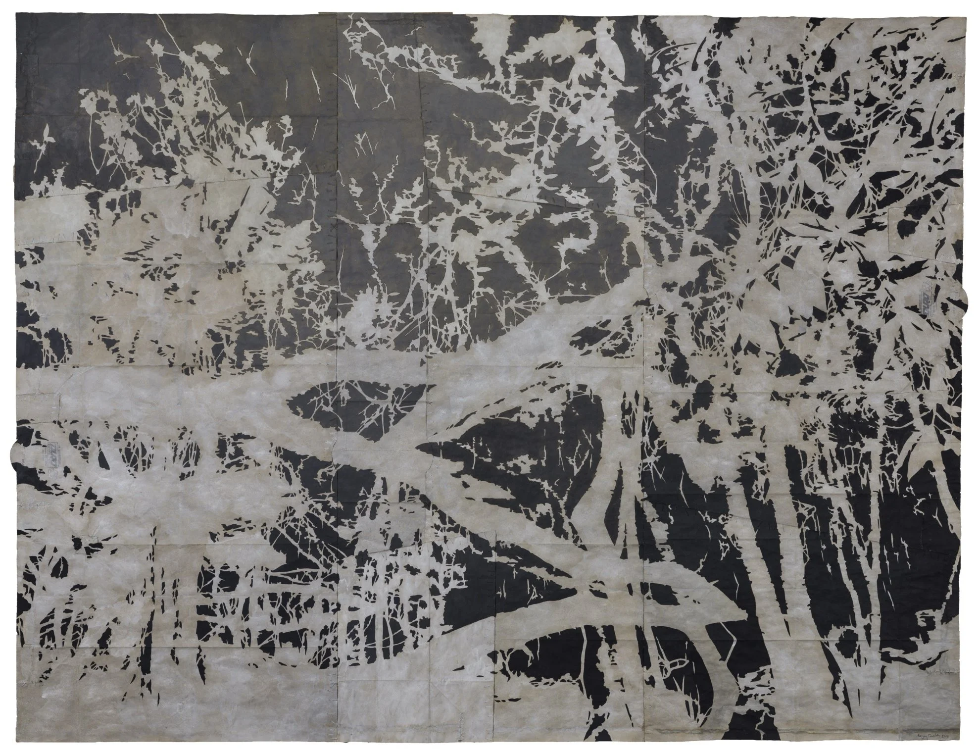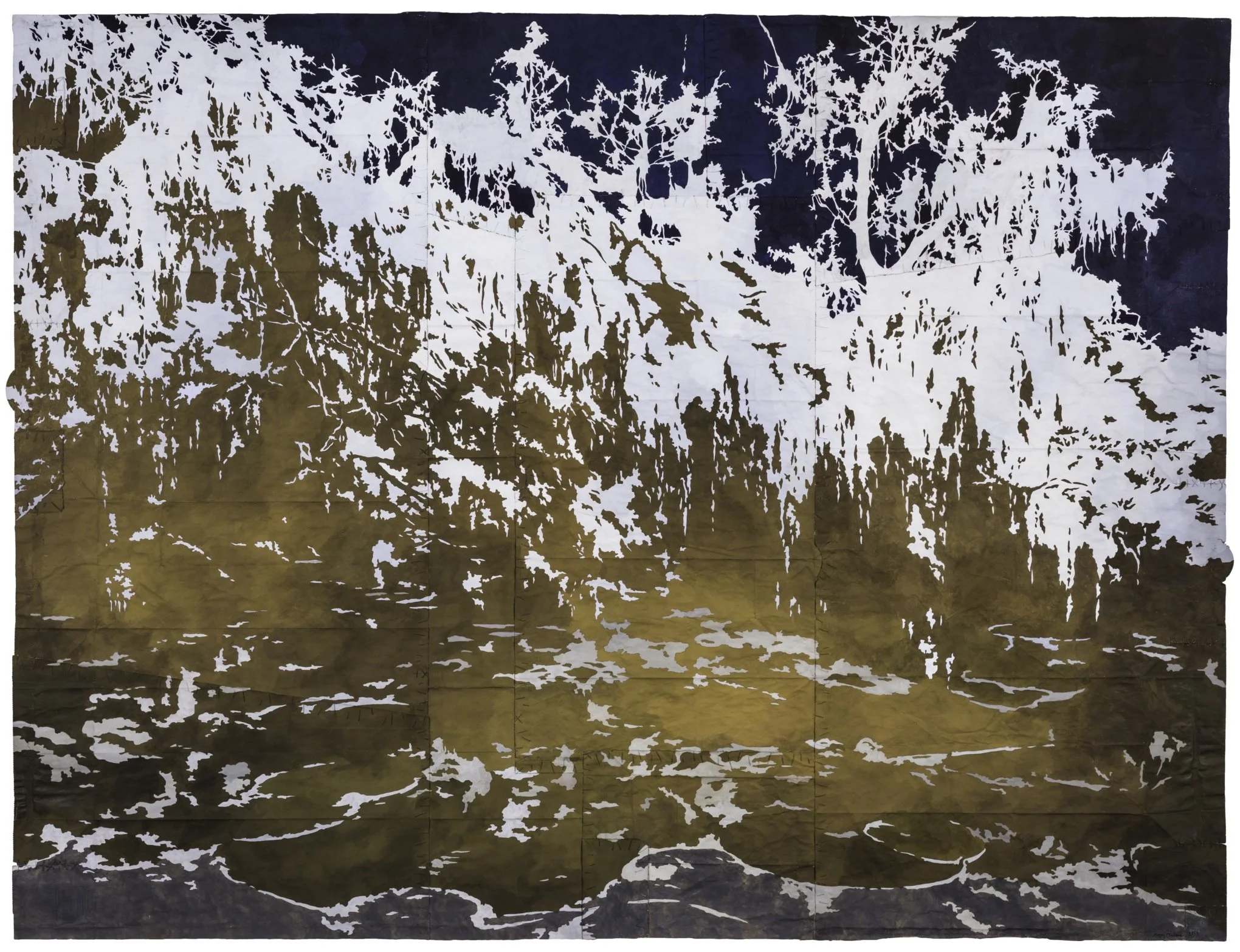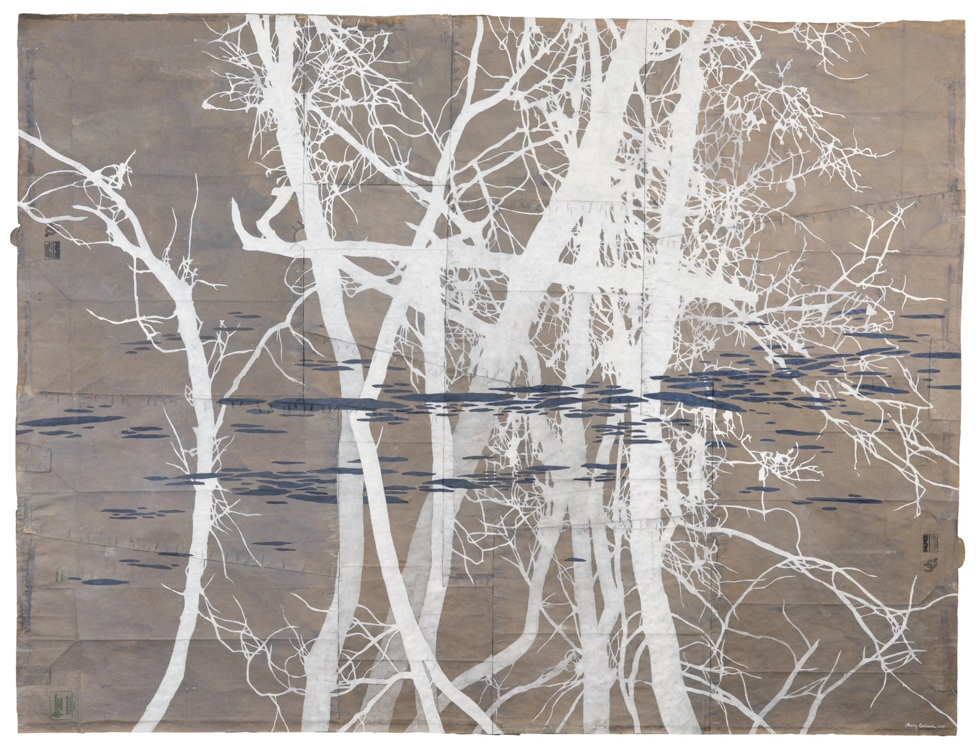 A Labyrinth of Tides, 2017. Gouache and thread on archivally treated paper bags. 47.5 x 62.5 inches
