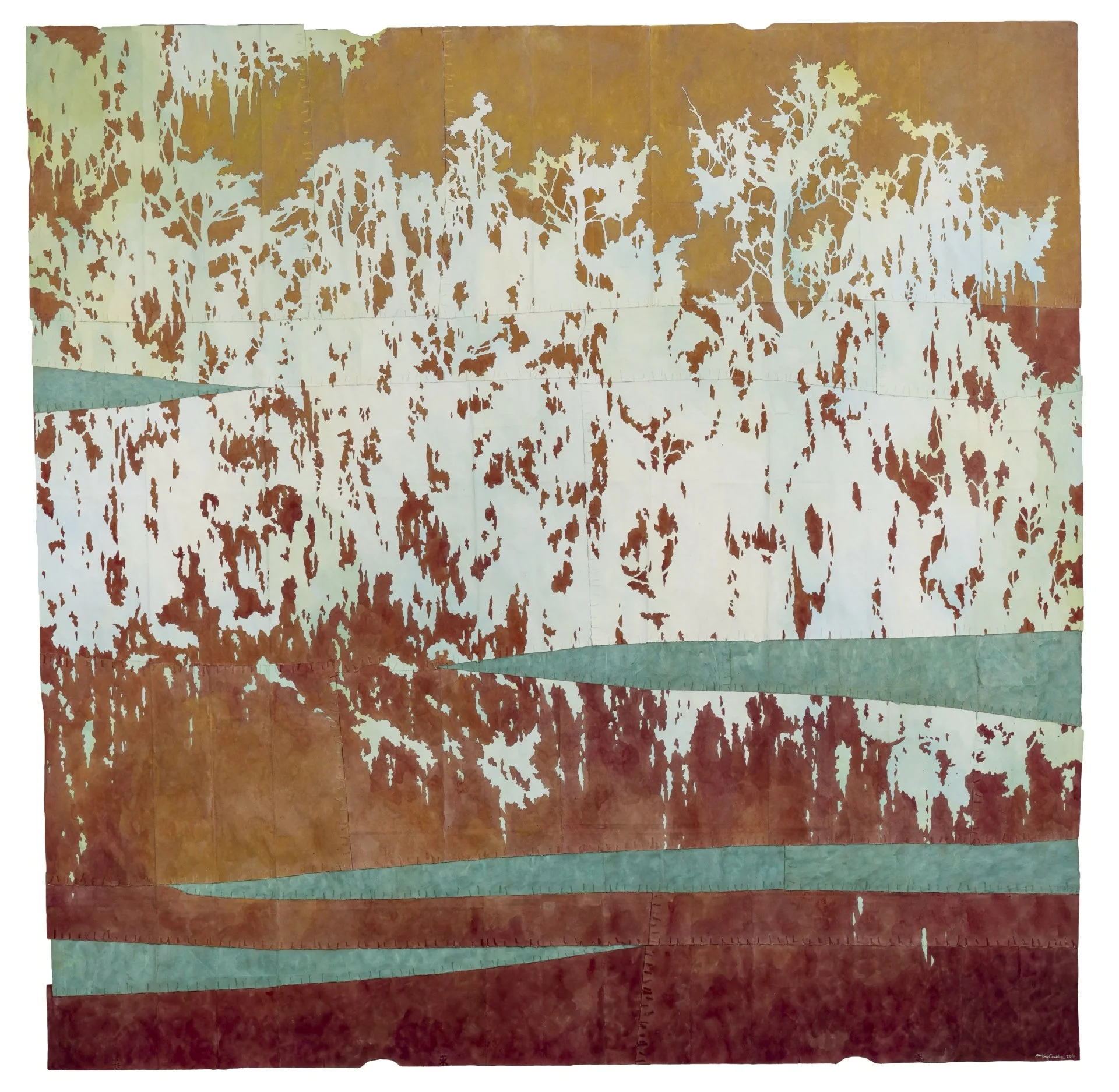 Meet me at the River Bank, 2017. Gouache and thread on archivally treated paper bags. 36 x 40 inches