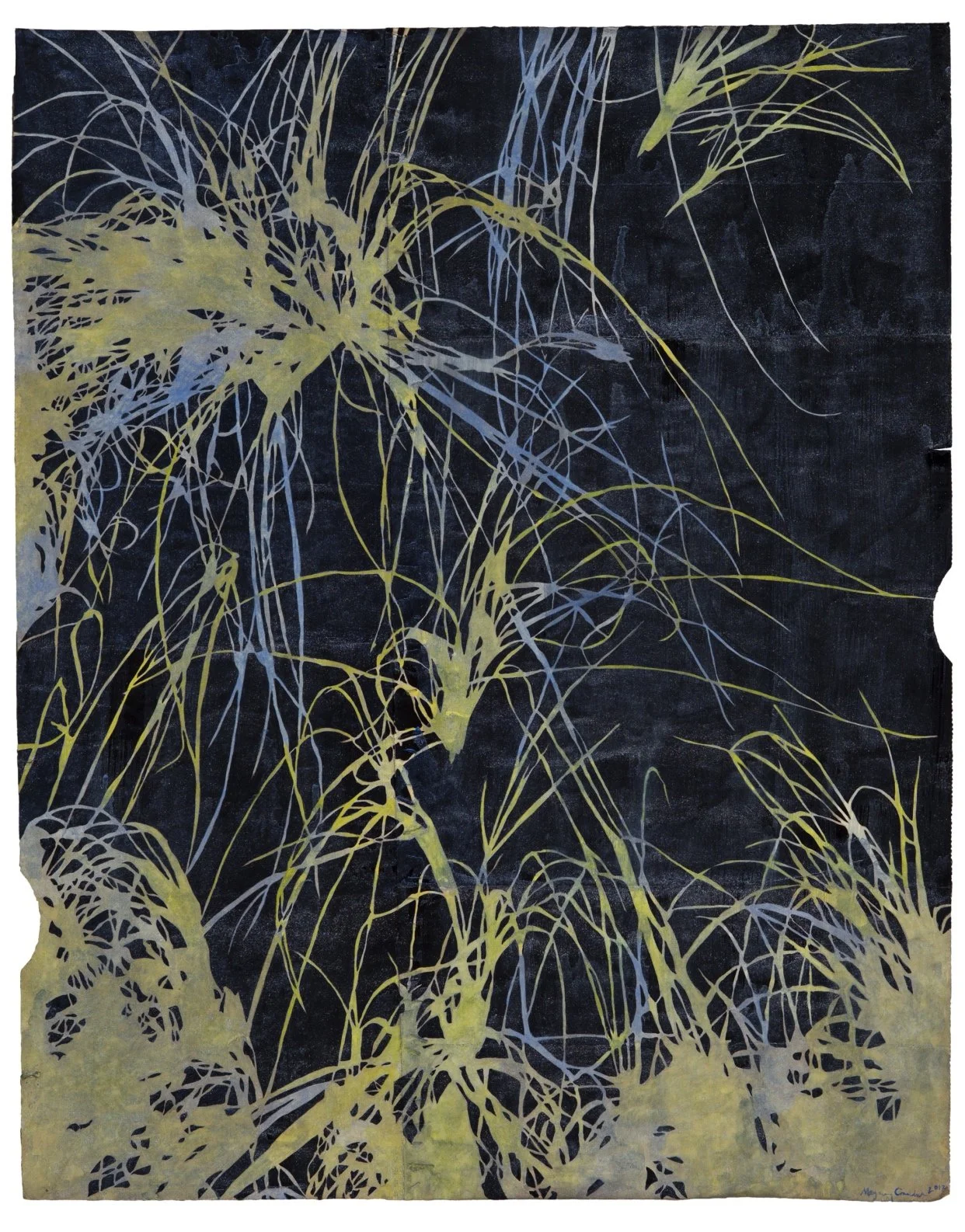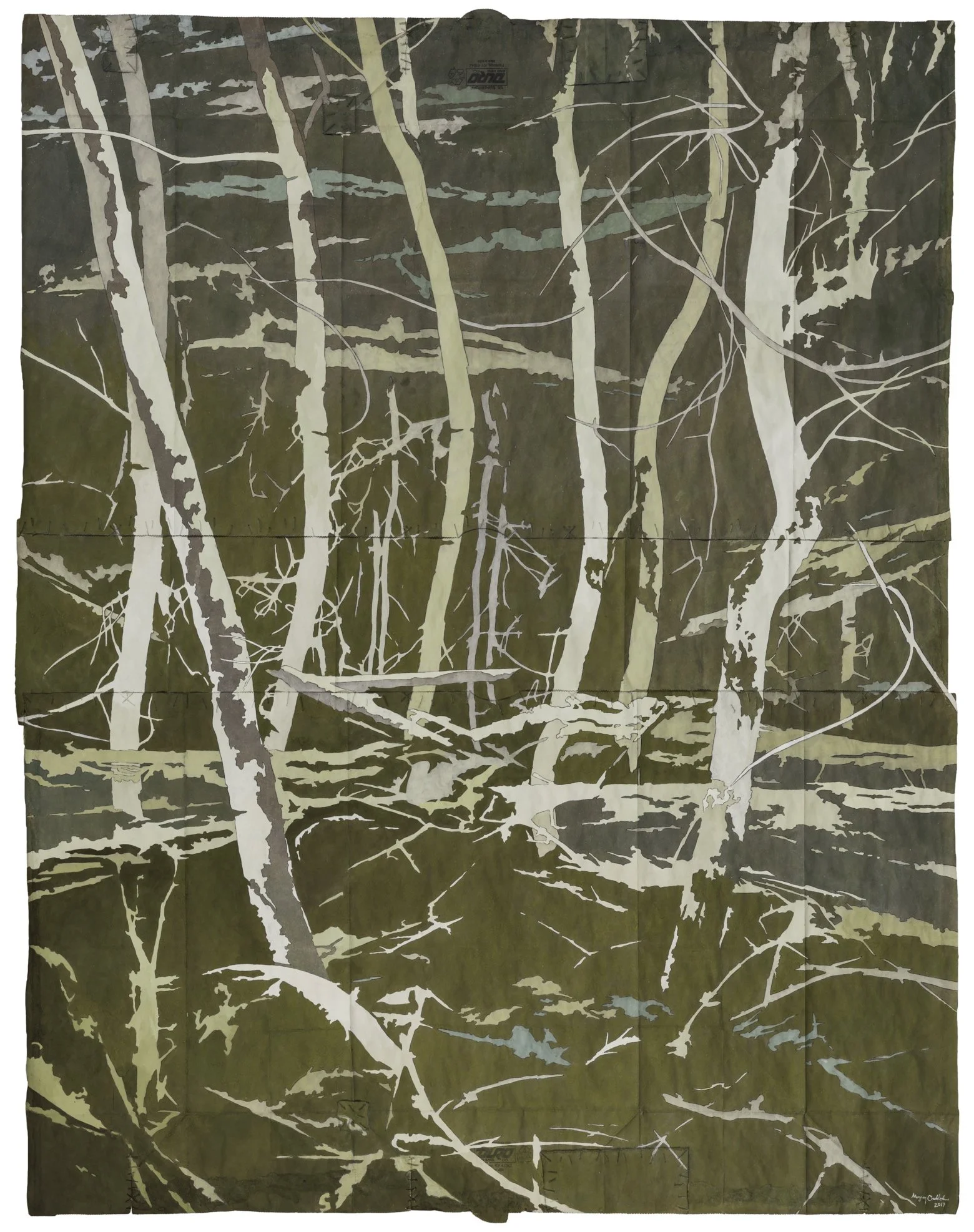 Slipstream, 2017. Gouache and thread on archivally treated paper bags. 47 x 62.5 inches