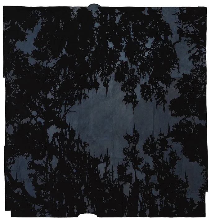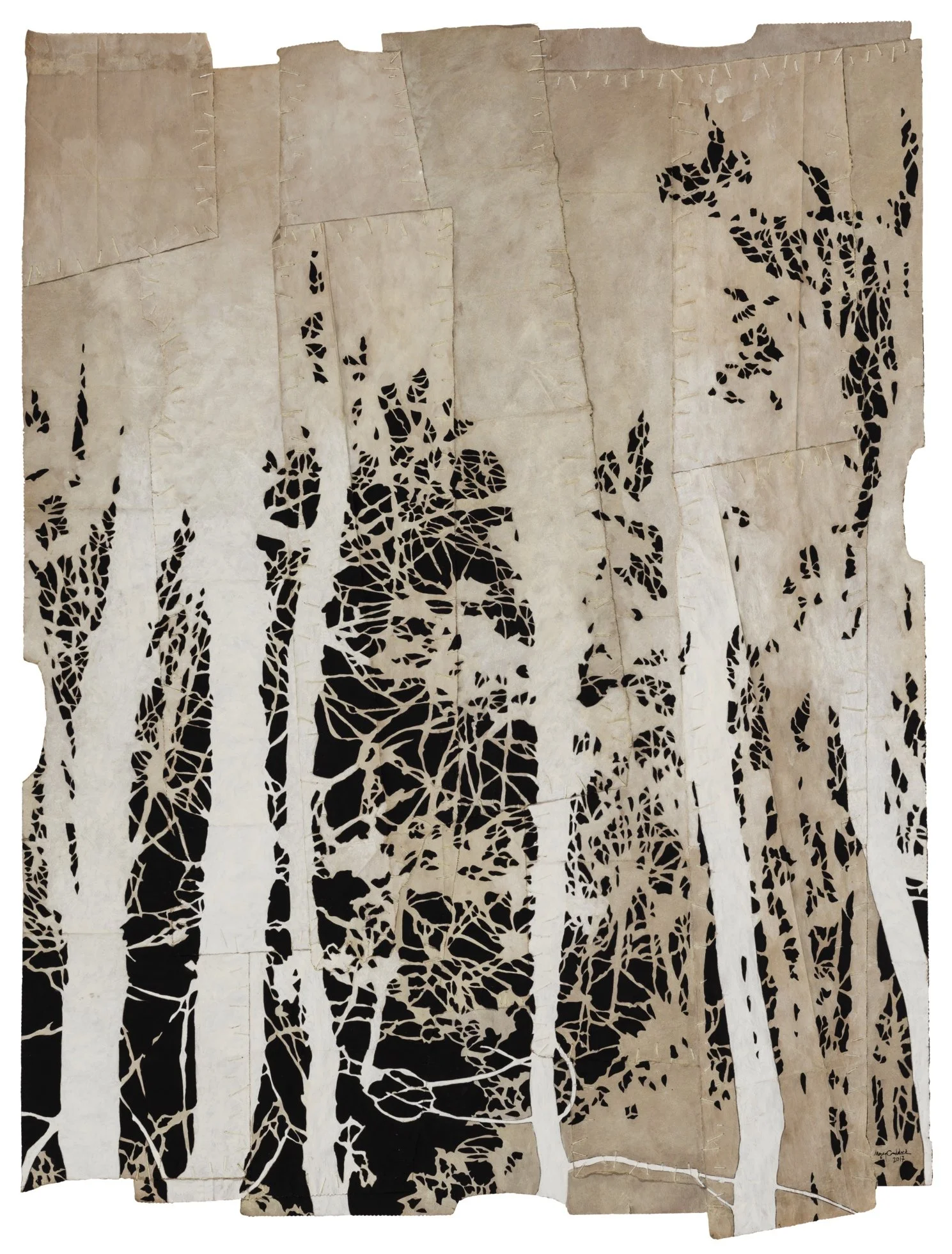 a whisper in the trees, 2017. Gouache and thread on archivally treated paper bags. 33.5 x 25 inches