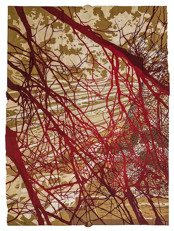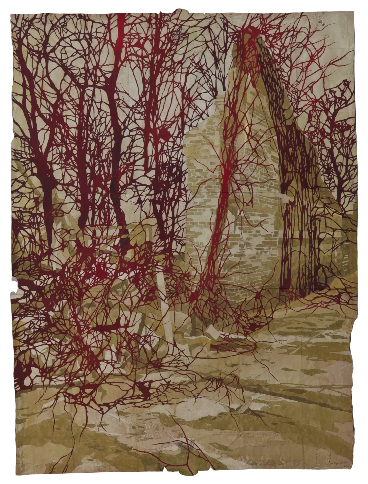 into the red ruin, 2012. Gouache and thread on archivally treated paper bags. 46 x 34 inches